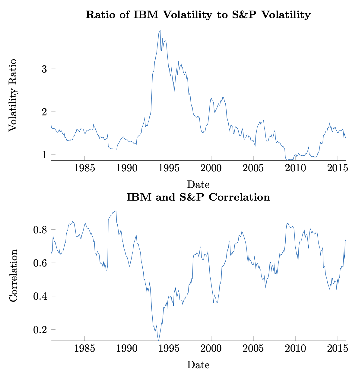 Figure 3.3. Top: IBM volatility to S&P volatility. Bottom: IBM-S&P correlation.