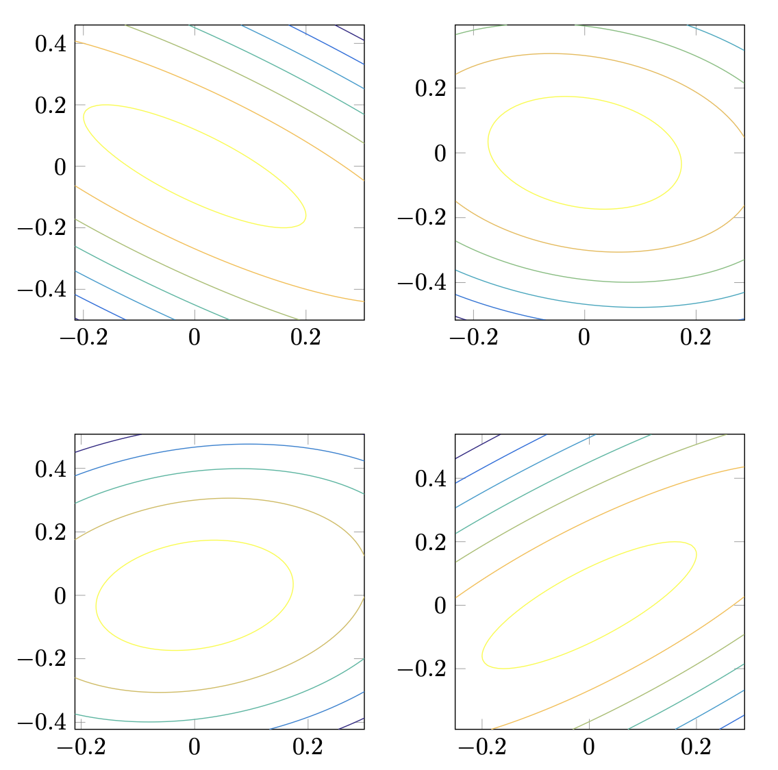 Figure 3.4: Simulated joint distributions using a copula approach, assuming a multivariate normal distribution with correlation parameter ranging from -0.8, -0.2, 0.2, and 0.8, clockwise from upper left subplot. In each case, the marginal distribution is fixed.
