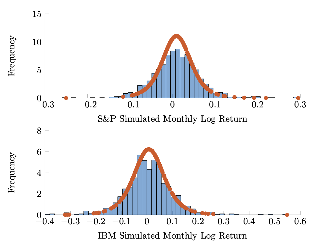 - Using the IBM/S&P daily return data, construct a copula function simulation with \(N = 1,000\) samples for the joint distribution of daily log returns where the joint distribution is Student \(t\) with five degrees of freedom with correlation matching the sample, and the marginals are also Student \(t\) with five degrees of freedom with means and volatilities matching the univariate sample means and standard deviations.