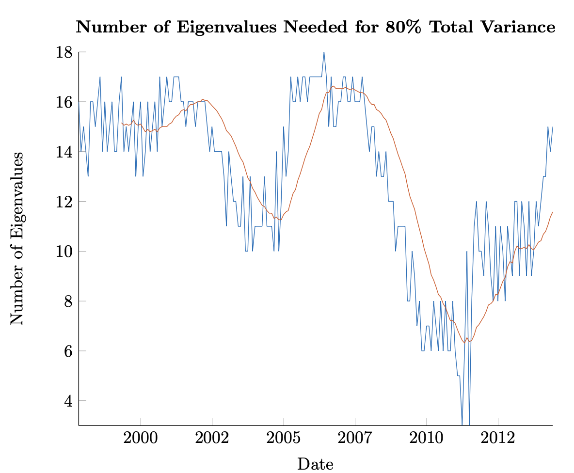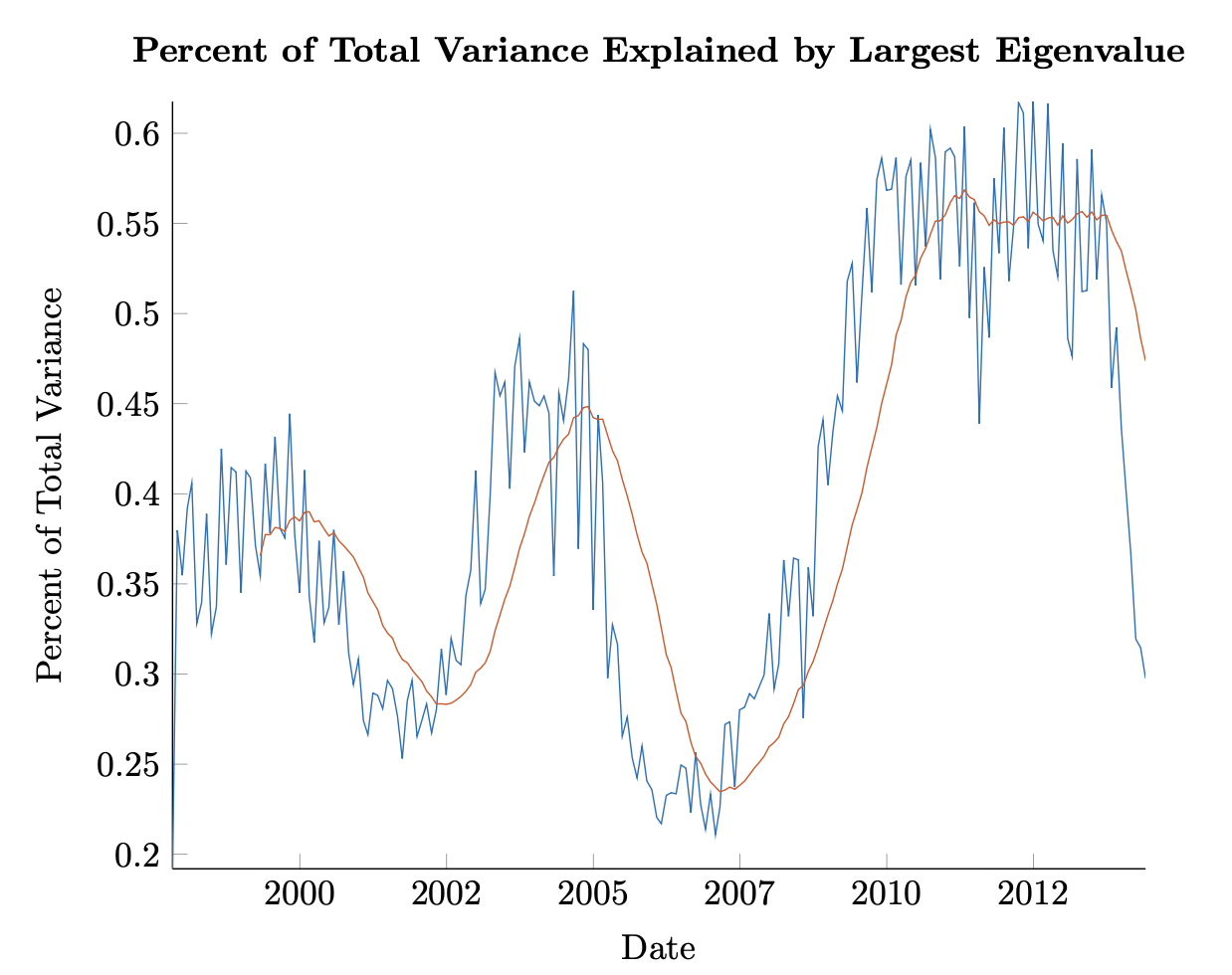Carrying this type of reasoning further, one may posit that if a necessary (but clearly not sufficient) condition for a bear market downturn is an uptick in the explanatory power of the largest eigenvalue, a crisis post 2015 would require a break in the elevated levels seen since 2008. There is minor evidence of this in the figure as well.